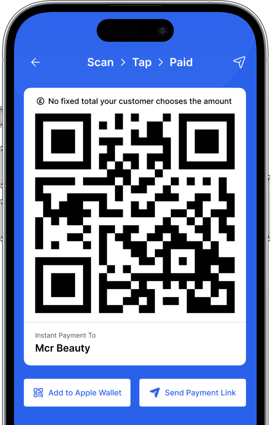 Show your Payme QR stored in Apple Wallet or Send your customer a payment link.