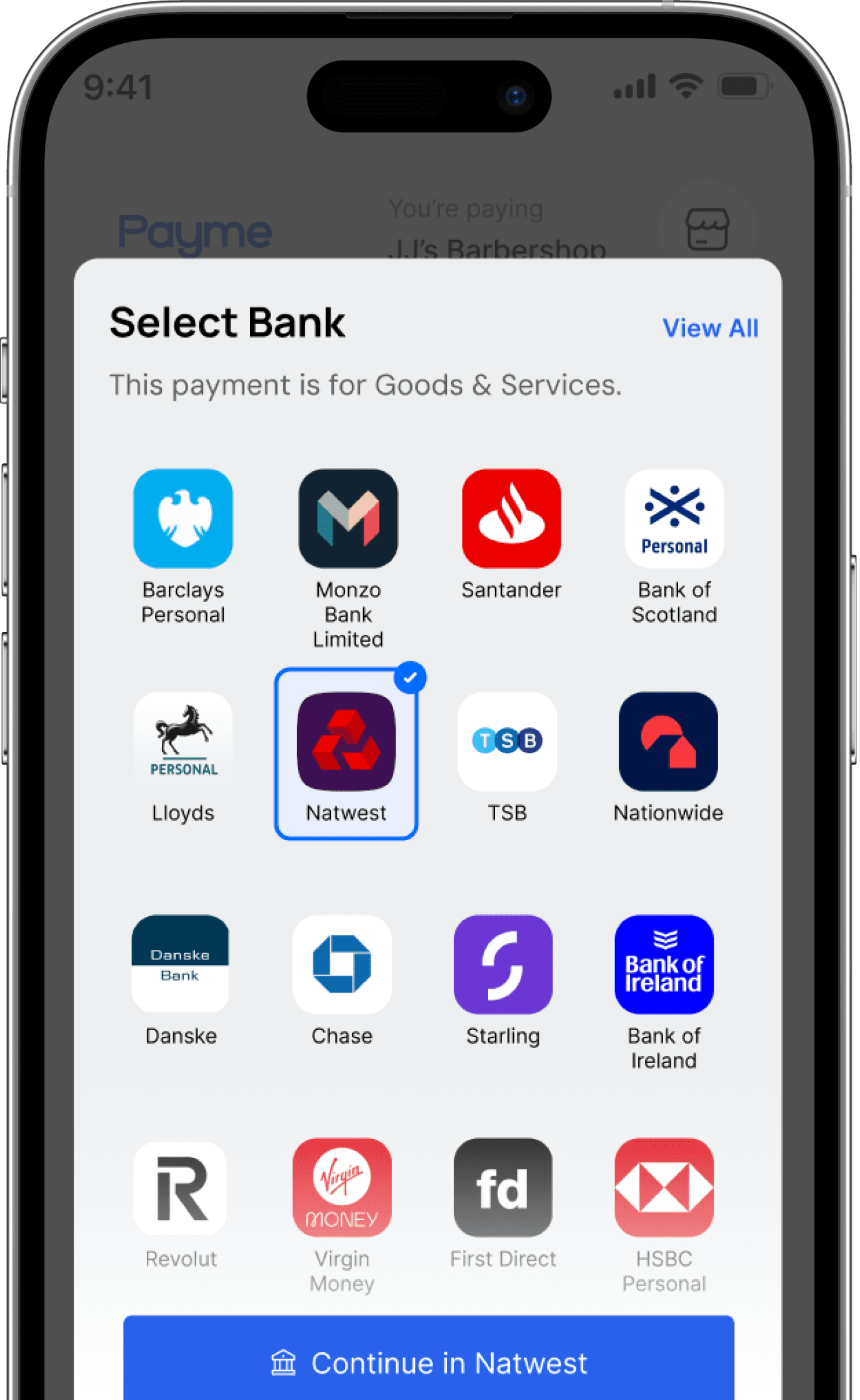 Accept bank transfers from any customer, no matter who they bank with. No restrictions, we work nationwide.
